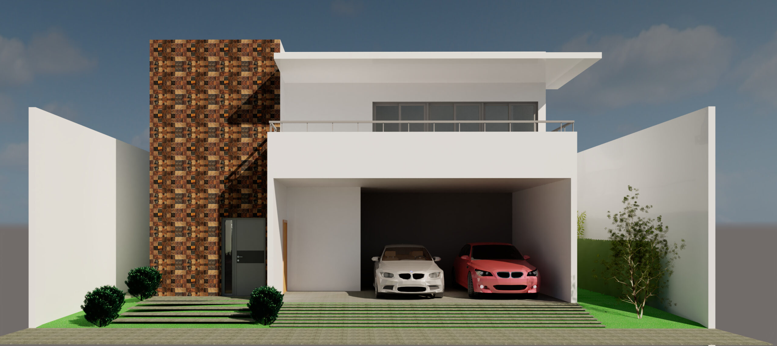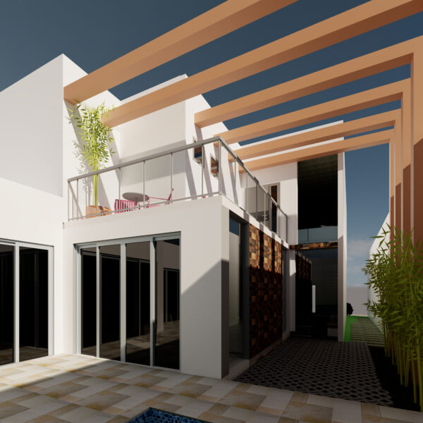 O pergolado em destaque, possui duas funções, a de criar uma cobertura para a varanda do piso superior e um túnel de transição que leva à area de lazer.